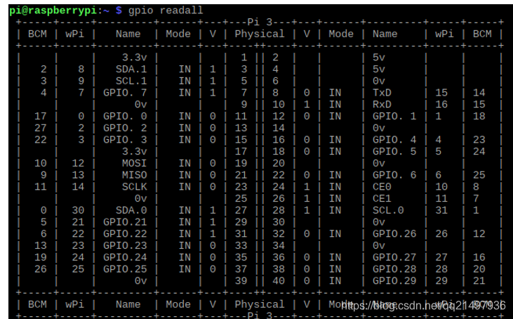 我们操作引脚的时候,引脚序号就为8(wPI),当前模式为输出,V代表的是当前的输入电压,1:3.3V,0:0V。