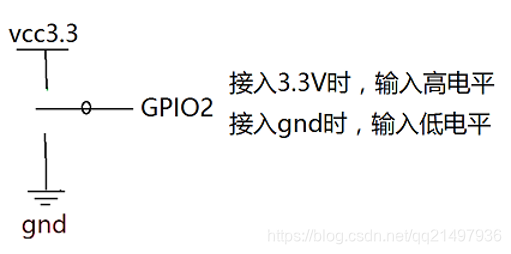 使用物理引脚3,默认功能为GPIO2,我们使用GPIO2接受输入,此时涉及到硬件知识,让树莓派的GPIO口的输入电压为3.3V/0V即为输入1还是输入0,也涉及到限流电阻,一般使用1K或者10K的,因为是测试,此处不使用限流电阻,在开发的过程中,需要根据实际情况设计电路原理图。