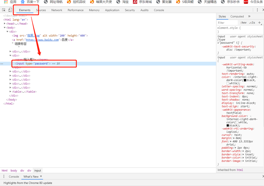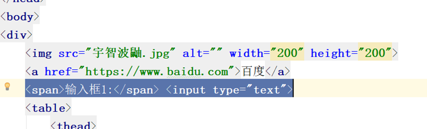 <div><img src="宇智波鼬.jpg" alt=""width="200" height="200"><a href="https://www.baidu.com">百度</a><table><thead>tr>td*3</thead> 按Tab即可 头文件<tbody>tr>td*3tbody> 以头文件的格式展开存储内容</table>