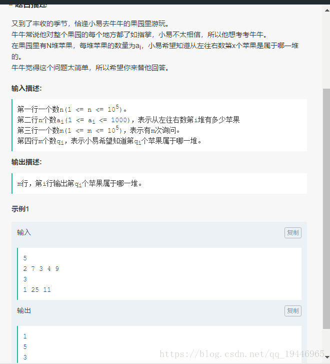package wangyi123;import java.util.Scanner;public class groupNum {public static void main(String[] args) {Scanner sc = new Scanner(System.in);while (sc.hasNext()) {int n = sc.nextInt();int[] arr = new int[n];arr[0] = sc.nextInt();for (int i = 1; i < n; i++) {arr[i] = arr[i - 1] + sc.nextInt();}int m = sc.nextInt();int query = 0;int index = 0;for (int i = 0; i < m; i++) {query = sc.nextInt();index = search(arr, query);System.out.print(index + " ");}}sc.close();}public static int search(int a[], int target) {int left = 0;int right = a.length - 1;int mid = 0;while (left < right) {mid = left + (right - left) / 2;if (target >= a[mid]) {left = ++mid;} else {right = mid;}}return left + 1;}
