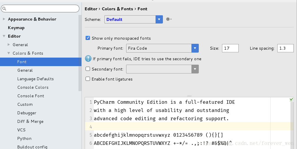 file----->settings--->editor----->colors&fonts----->font,根据自己的需要调整即可。
