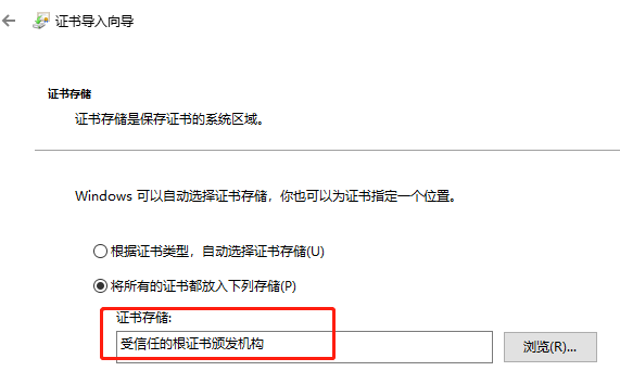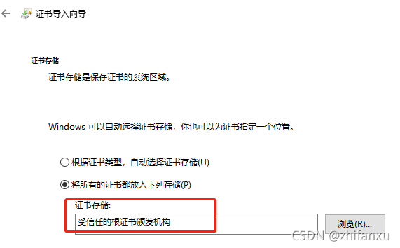 注意:证书存储的位置要选择‘受信任的根证书颁发机构’