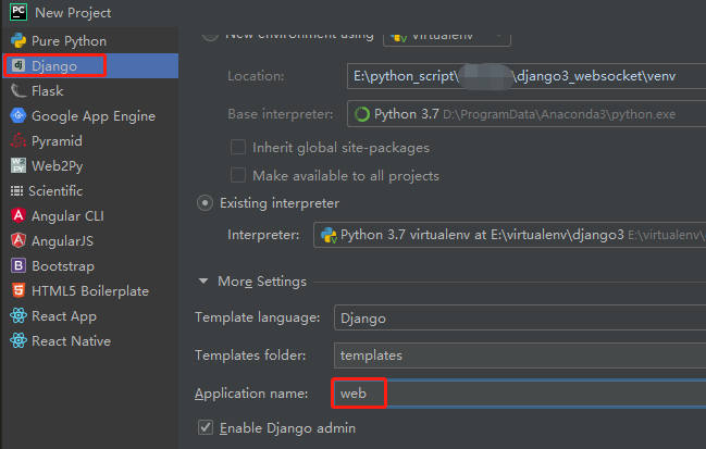 新建项目:django3_websocket,应用名称:web
