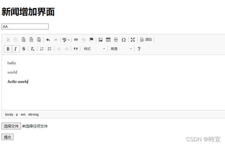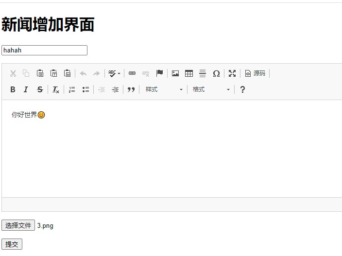 <h1>新闻增加界面</h1><form action="doAdd.jsp" method="post" enctype="multipart/form-data"><p><input type="text" name="title"></p><%--定义文本域 文本域需要id --%><p><textarea id="myEditor" type="text" name="content"></textarea></p><p><%--文件选择器 --%><input type="file" name="myFile"></p><button>提交</button>