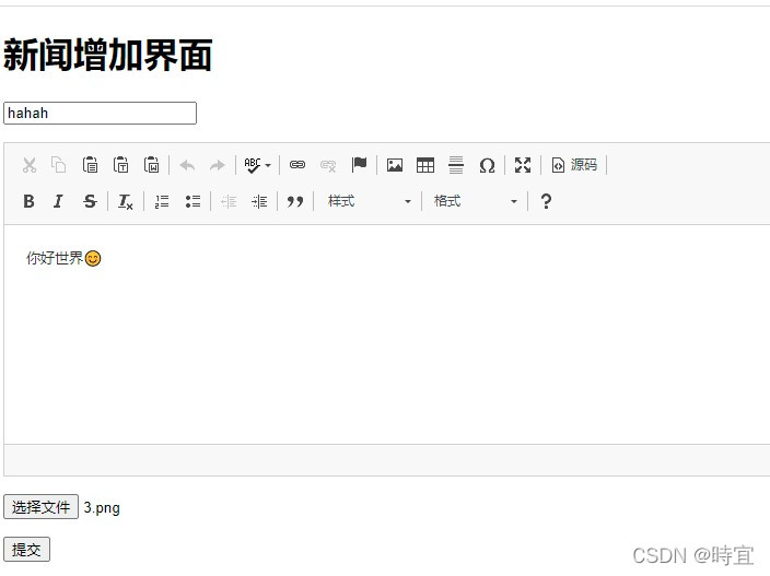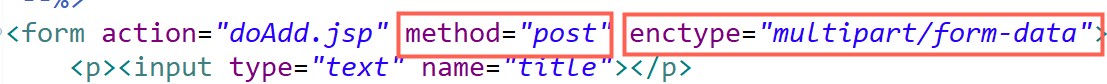 <form action="doAdd.jsp" method="post" enctype="multipart/form-data"><p><input type="text" name="title"></p><%--定义文本域 文本域需要id --%><p><textarea id="myEditor" type="text" name="content"></textarea></p><p><%--文件选择器 --%><input type="file" name="myFile"></p><button>提交</button>