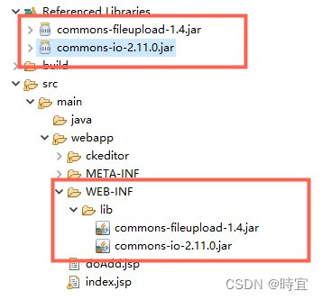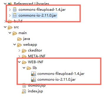 1、使用commons fileUpload 组件需要在项目中引入jar包。并将jar包添加到webapp/WEB-INF/lib目录下 如下如所示: