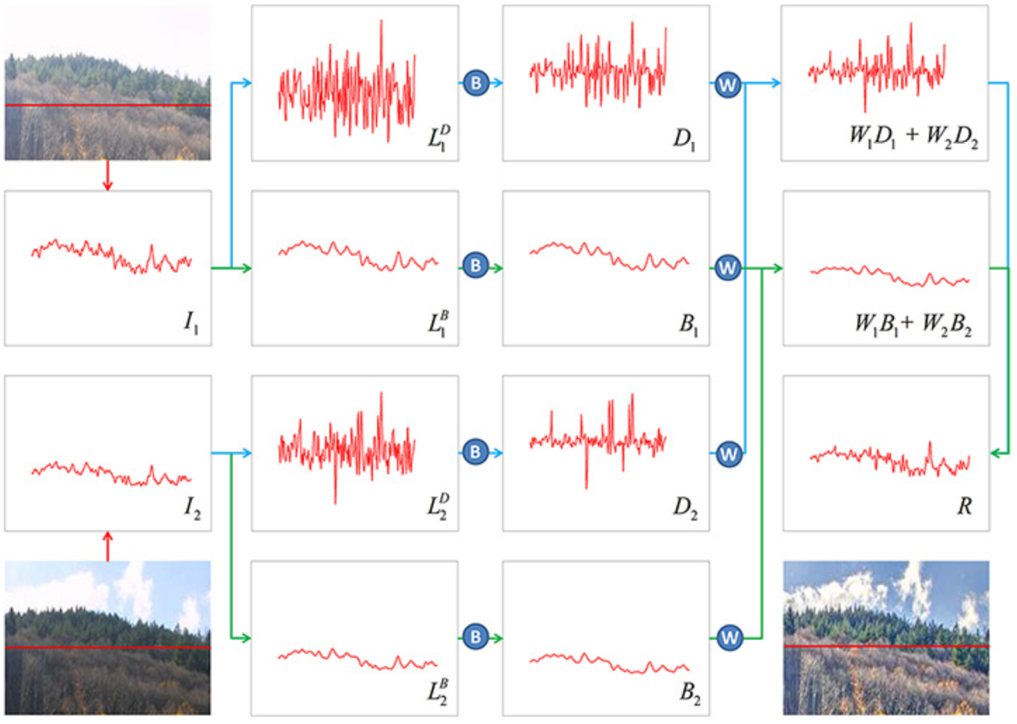 以两帧图像的融合为例,记拉普拉斯金字塔的顶层为 L i B L^{B}_{i} LiB,其他层为 L i , j D L^{D}_{i,j} Li,jD, j j j为细节层的索引。