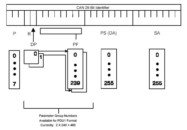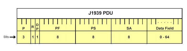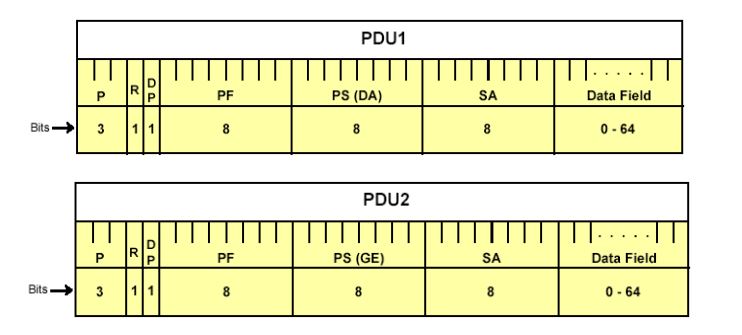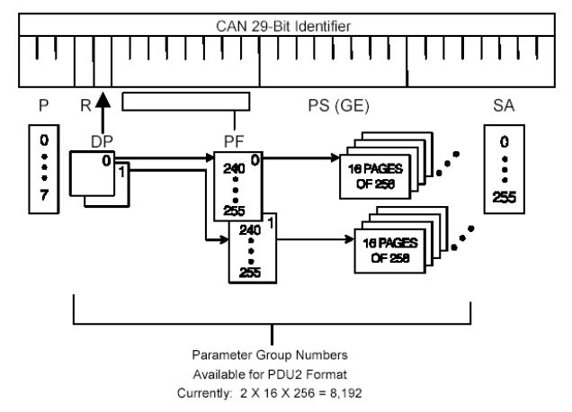 P是优先级, R是保留位, DP是数据页, PF是PDU格式, PS是特定PDU, SA是源地址