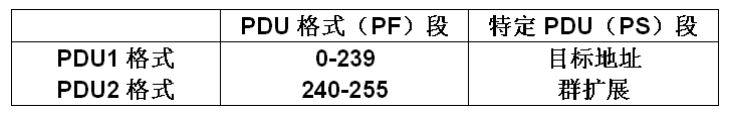 两 种 PDU 格 式 定 义 为 : PDU1 格 式( PS为目标地址)和PDU2格式( PS为群扩展)。 PDU1格式允许CAN数据定向到特定目标地址(设备)。 PDU2格式只用于无特定目标地址(设备)的CAN数据帧的传输。使用两种不同PDU格式是为了在通信中提供更多参数群编号的组合。