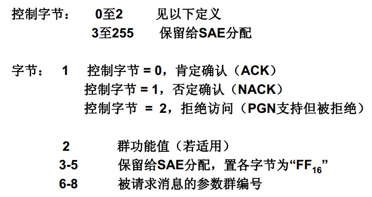 此消息类型包括那些从某个源地址命令特定目的地或全局目的地的参数群,目的地接收到命令类型的消息后应该采取特定的动作。 PDU1格式( PS为目标地址)和PDU2格式( PS为群扩展)都能用作命令。命令类型的消息可能包括传动控制、地址请求、扭矩/速度控制等等。
