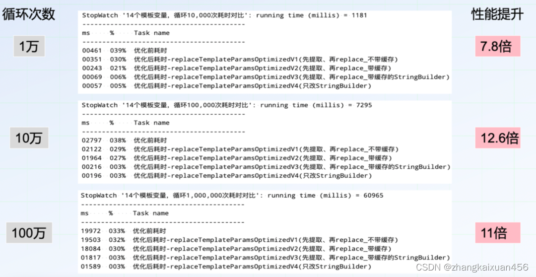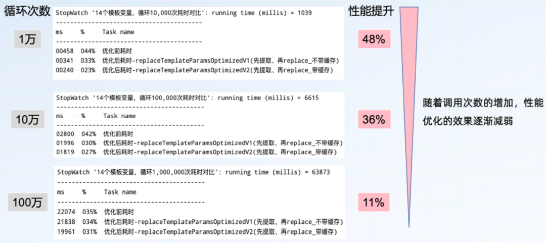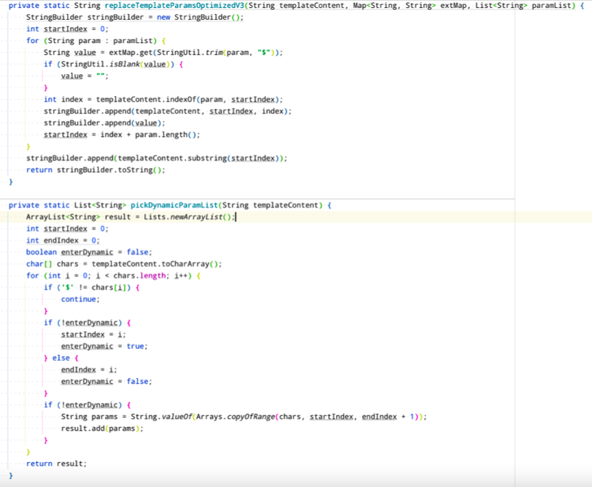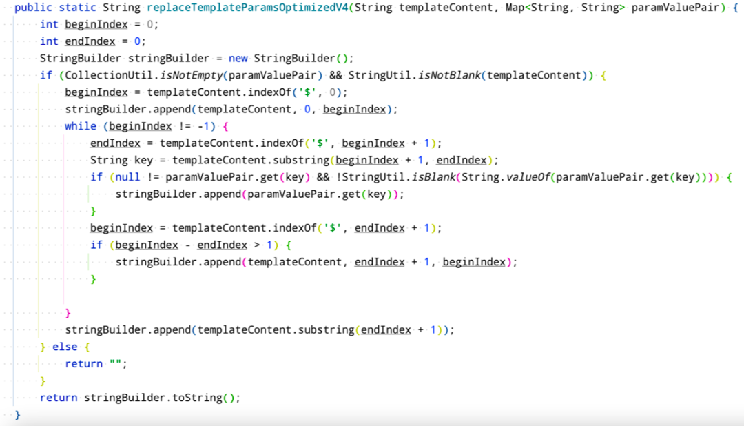 V3版优化之后,性能提升明显,证明String.replace 方法才是整个模板变量替换逻辑中最为耗时的点。于是在原方法上只用StringBuilder 来替换String.replace ,得到V4版。