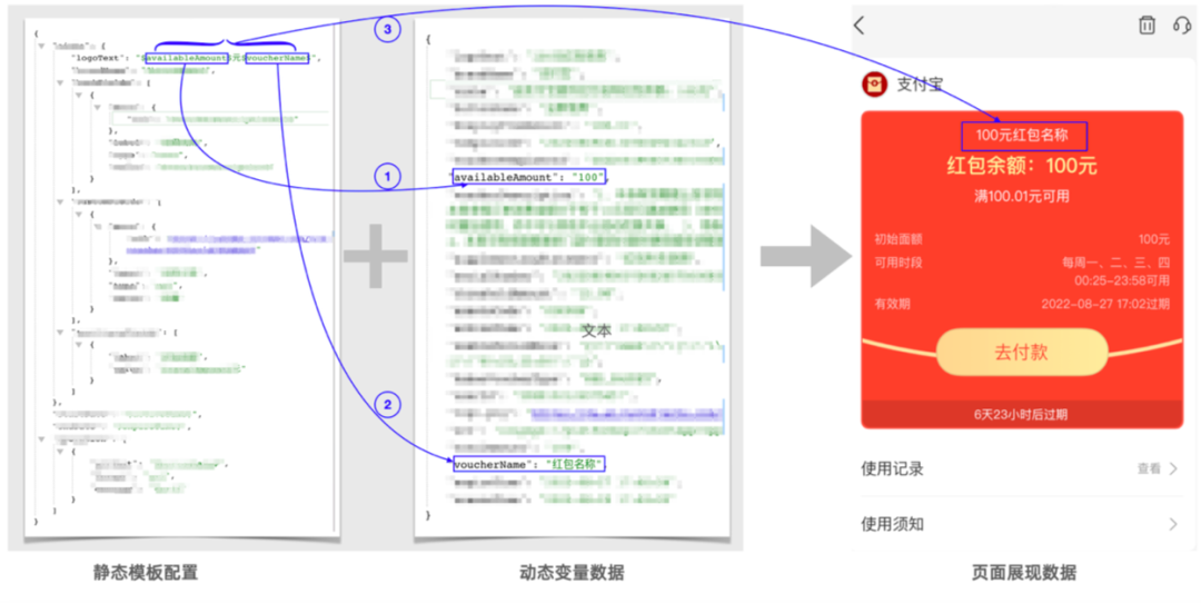 以【图2】为例,模板中有availableAmount 和voucherName 两个变量,这两个变量在动态变量数据有对应的值。用动态的值替换掉模板里面对应的这两个变量,最后拼装成“100元红包名称”。当这个红包被使用了一次,消费了30元后,动态数据里面availableAmount 的值就会变成70。用户再次进入到红包详情页时,展现数据重新组装后就会变成“70元红包名称”。