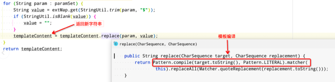 回过头来再仔细看一遍变量替换逻辑,突然间意识到遗漏了一个”大问题“。就是这个String.replace 方法,该方法有两个耗时点: