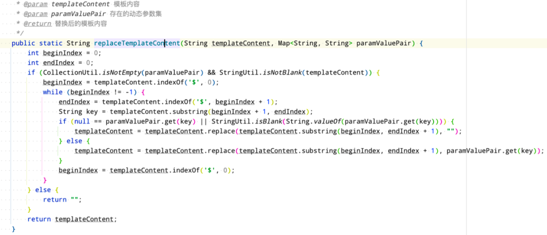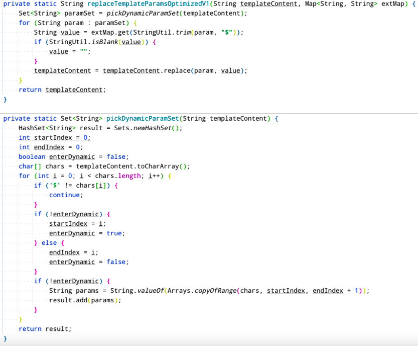 之前的替换逻辑是从头到尾循环模板内容字符串,遇到$ 之间的变量就进行替换,过程中需要不断的进行indexOf 和substring 操作。新的实现方式是在进行变量替换之前,通过循环模板内容字符串,利用双指针把模板里面所有变量都提取出来,再对变量集合进行循环,依次替换掉模板内容里面的变量。