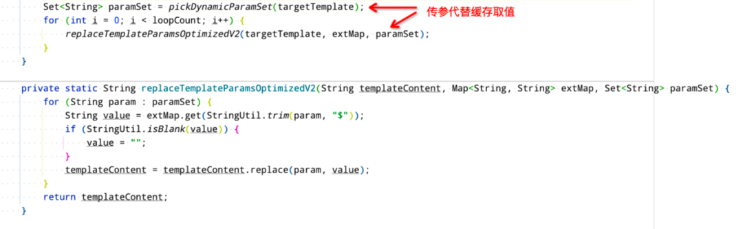 静态模板配置一般情况下不会发生变更。也就意味着,同一个模板对应的变量都是固定不变的。可以将模板id和模板变量集合进行一对一的缓存,减少每次替换之前的变量提取。