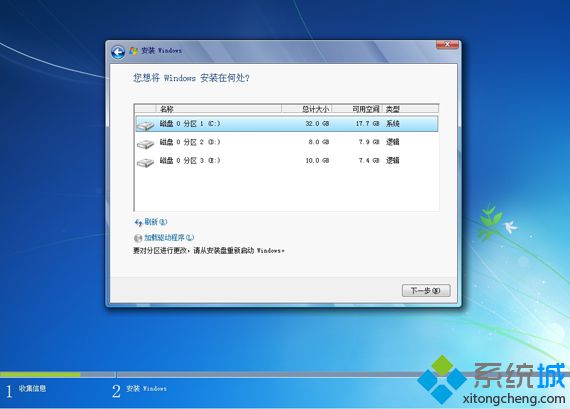 5、在磁盘分区界面,选择系统安装位置,以下图为例,选择C盘,下一步(C盘必须要有足够的空间);