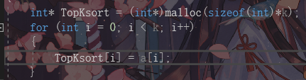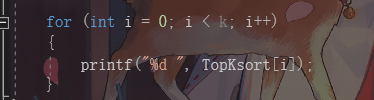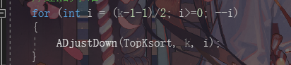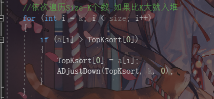 {int* TopKsort = (int*)malloc(sizeof(int)*k);for (int i = 0; i < k; i++){TopKsort[i] = a[i];}//建K的小堆for (int i = (k-1-1)/2; i>=0; --i){ADjustDown(TopKsort, k, i);}//依次遍历Size-K个数 如果比K大就入堆for (int i = k; i < size; i++){if (a[i] > TopKsort[0]){TopKsort[0] = a[i];ADjustDown(TopKsort, k, 0);}}for (int i = 0; i < k; i++){printf("%d ", TopKsort[i]);}