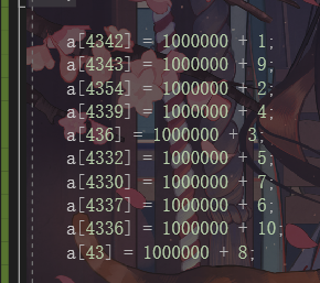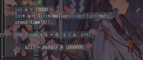 {int n = 10000;int* a = (int*)malloc(sizeof(int)*n);srand(time(0));for (size_t i = 0; i < n; i++){a[i] = rand() % 1000000;}a[4342] = 1000000 + 1;a[4343] = 1000000 + 9;a[4354] = 1000000 + 2;a[4339] = 1000000 + 4;a[436] = 1000000 + 3;a[4332] = 1000000 + 5;a[4330] = 1000000 + 7;a[4337] = 1000000 + 6;a[4336] = 1000000 + 10;a[43] = 1000000 + 8;TopK(a, n, 10);return 0;