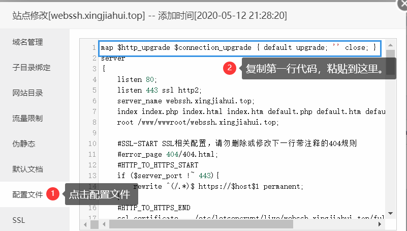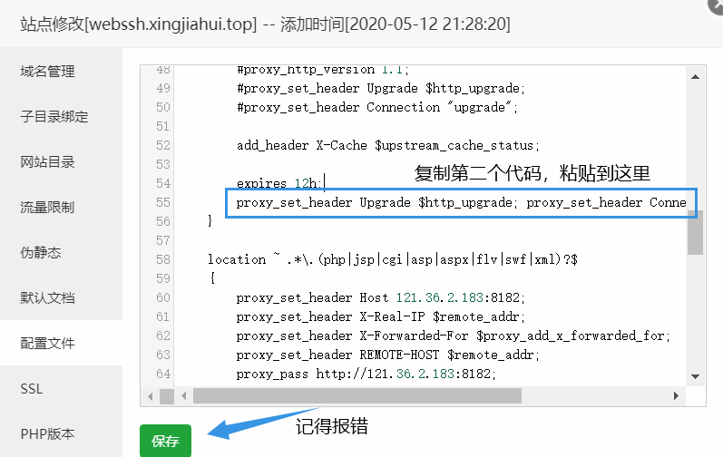 }location /sshwifty/socket {proxy_pass http://你的ip:端口号;proxy_http_version 1.1;proxy_set_header Host $host;proxy_set_header X-Real-IP $remote_addr;proxy_set_header X-Forwarded-For $proxy_add_x_forwarded_for;proxy_set_header X-Forwarded-Proto https;proxy_set_header Upgrade $http_upgrade;proxy_set_header Connection $connection_upgrade;