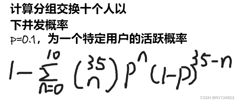 对于分组交换,一个特定用户活跃的概率为10%,如果总共有35个用户,有十个及其以下的用户并发的概率为0.9996(99.96%),因此并发活跃用户超过10个人的概率极小(0.04%),分组交换差不多总是提供了与电路交换相同的性能
