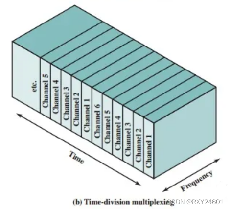 对于TDM,时间被划分为固定期间的帧,并且每个帧又被划分为固定数量的时隙。也就是大家同频率传输,但是传输时间不同。比如把1秒钟(或更小的一个时间单位)分成六个相等的小时间单位,时间单位1给channel1用,时间单位2给channel 2用...以此类推。