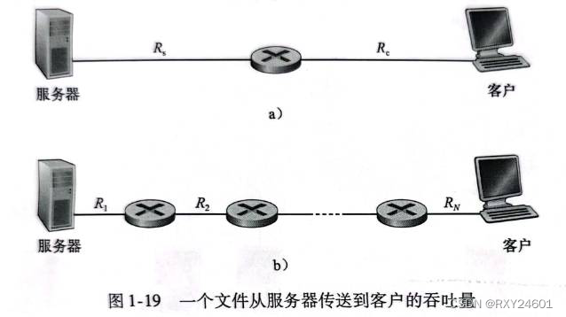 令Rs表示服务器与路由器之间的链路速率,Rc表示路由器与客户之间的链路速率。端到端的平均吞吐量取决于Rs与Rc较小的。