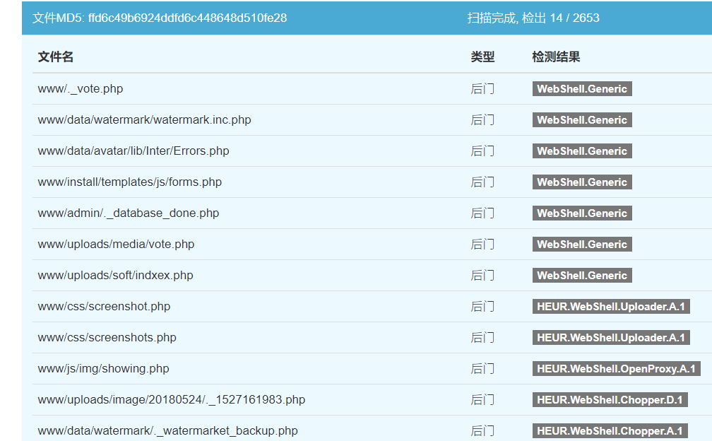 下载完成后本地使用腾讯管家和360扫描了一下,果然发现木马,被感染的是图片和php文件,直接删除,然后从之前备份的未被感染的文件复制一份过去。