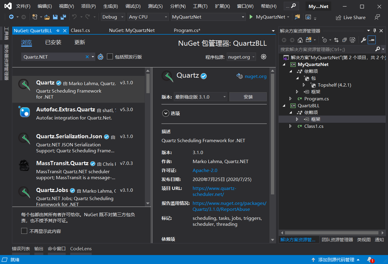 先创建一个类库QuartzBLL,并安装Quartz引用: