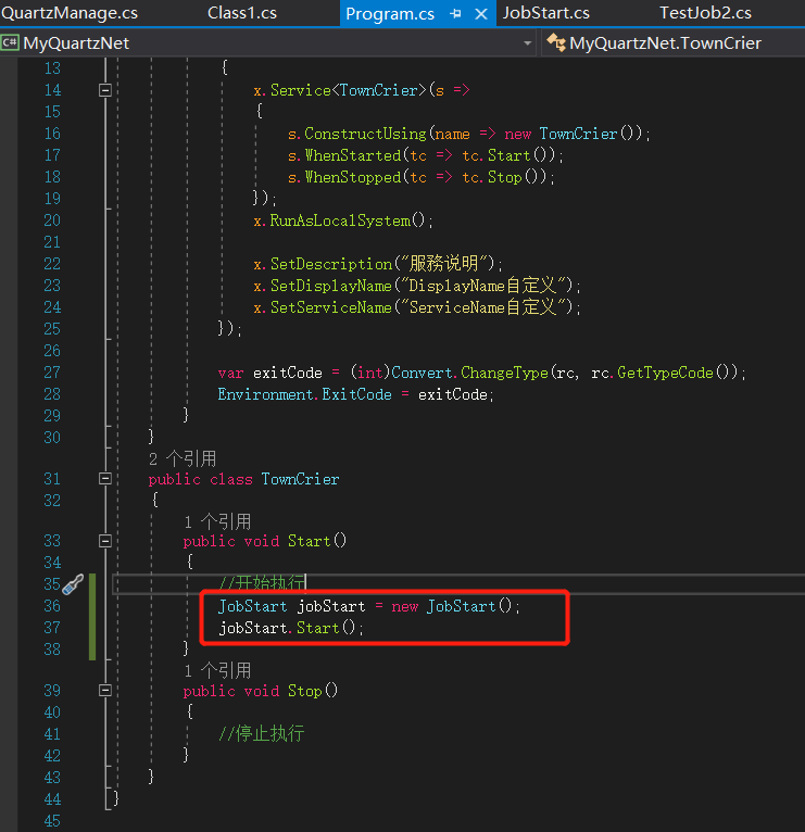 public class JobStart{public void Start(){QuartzManage.StartJobWithCron<TestJob1>("TestJob1", "0/5 * * * * ?");//5秒钟一次QuartzManage.StartJobWithCron<TestJob2>("TestJob2", "0/8 * * * * ?");//8秒钟一次Console.ReadLine();}}