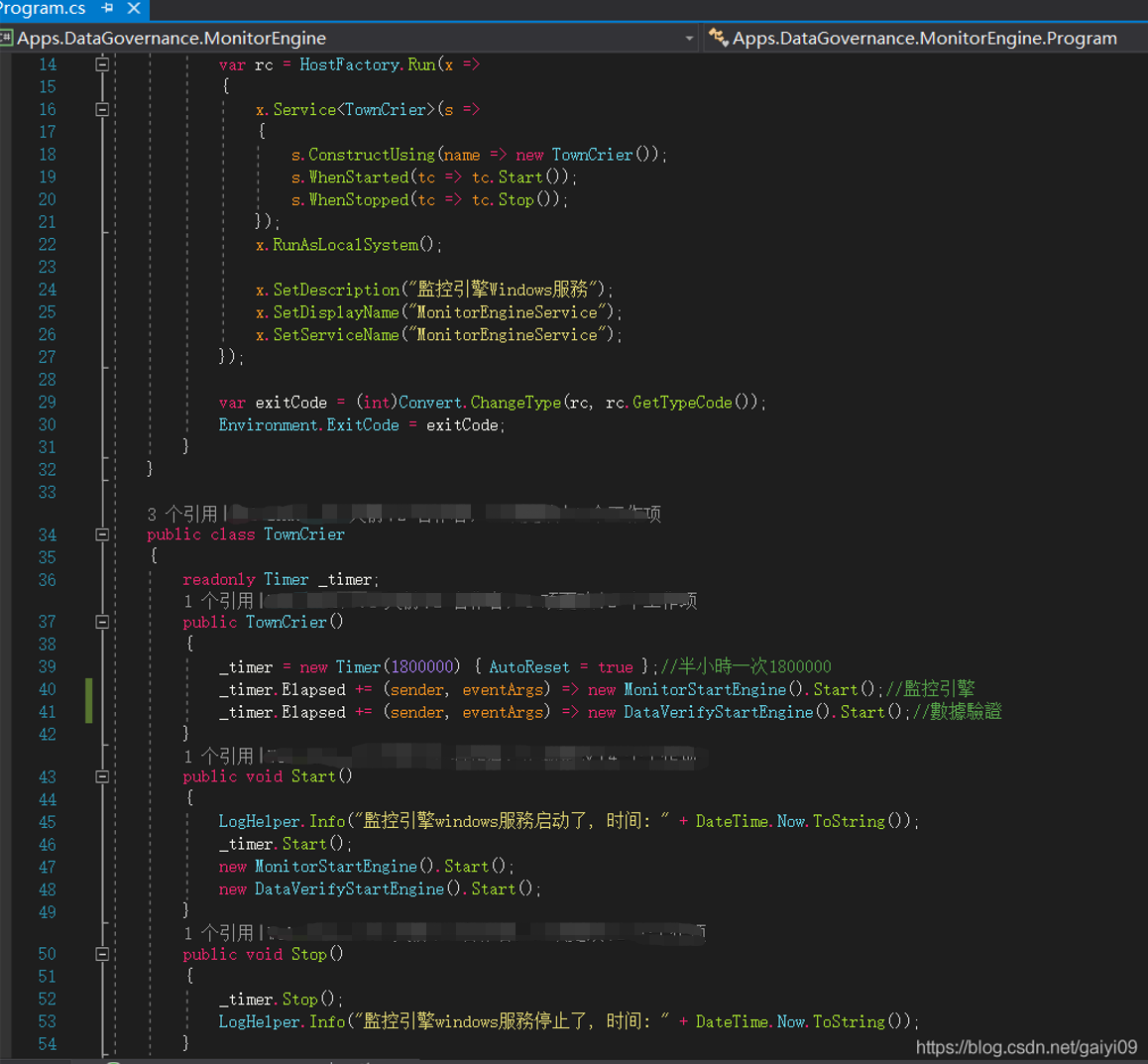 class Program{static void Main(string[] args){var rc = HostFactory.Run(x =>{x.Service<TownCrier>(s =>{s.ConstructUsing(name => new TownCrier());s.WhenStarted(tc => tc.Start());s.WhenStopped(tc => tc.Stop());});x.RunAsLocalSystem();x.SetDescription("服務说明");x.SetDisplayName("DisplayName自定义");x.SetServiceName("ServiceName自定义");});var exitCode = (int)Convert.ChangeType(rc, rc.GetTypeCode());Environment.ExitCode = exitCode;}}public class TownCrier{public void Start(){//开始执行}public void Stop(){//停止执行}}
