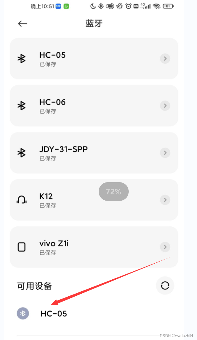 之后点击可用设备里的HC-05(默认名称)与其配对,输入默认密码即可。