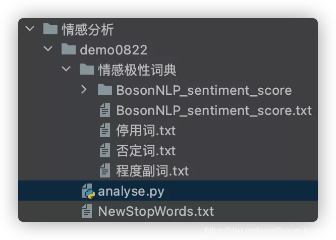 然后将分词后的情感词、否定词和程度副词通过情感词典文件、否定词文件、程度副词文件分别放入三个字典,为下面计算情感分数做铺垫: