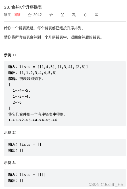 for i in range(k):if lists[i]:#current listnode is not Noneheappush(h, [lists[i].val,i])lists[i] = lists[i].next#prepare for next around of adding into the heapcur = cur.next#append the next node of list k if list k has other nodesif lists[cur_k]:heappush(h,[lists[cur_k].val, cur_k])lists[cur_k] = lists[cur_k].nextreturn res.next# Definition for singly-linked list.