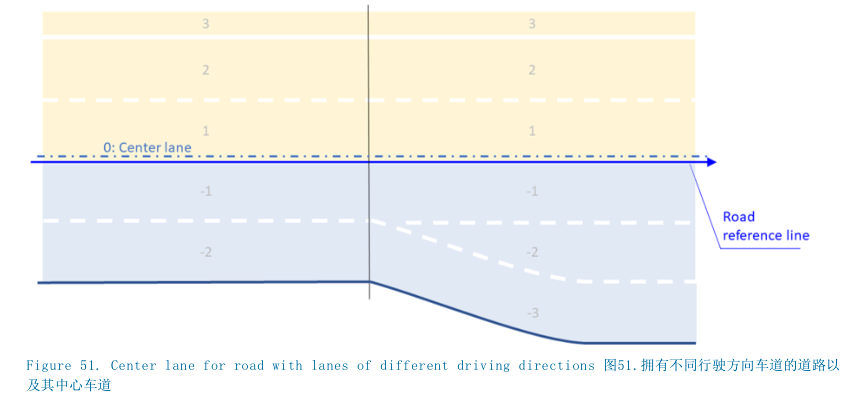 图51展示了一条道路的中心车道,该车道拥有多条交通车道以及不同的行驶方向。在这个示例中,根据靠左行车以及靠右行车的交通模式,中心车道将道路类型中定义的行驶方向分隔开来。由于并未使用车道偏移,因此中心车道等同于道路参考线。