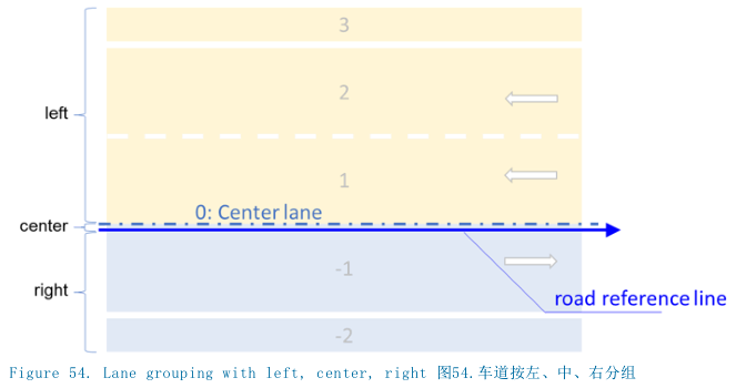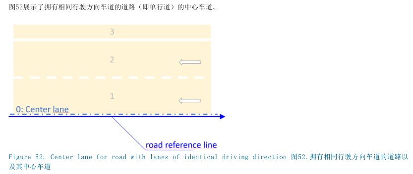为了能够便利地在OpenDRIVE的道路描述中进行查找,一个车道段内的车道可分为左、中和右车道。每个车道段均必须包含一个<center>元素和至少一个<right>或<left>元素。