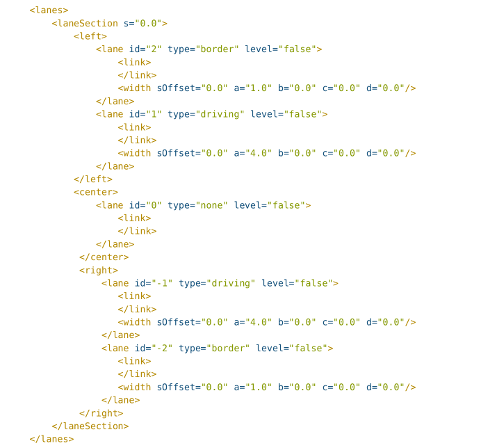 在OpenDRIVE中,车道组用 <laneSection> 元素内的 <center> 、 <right> 和 <left> 元素来表示。ID属性用嵌套在<center> 、 <right 和 <left> 元素里的 <lane> 元素来定义。