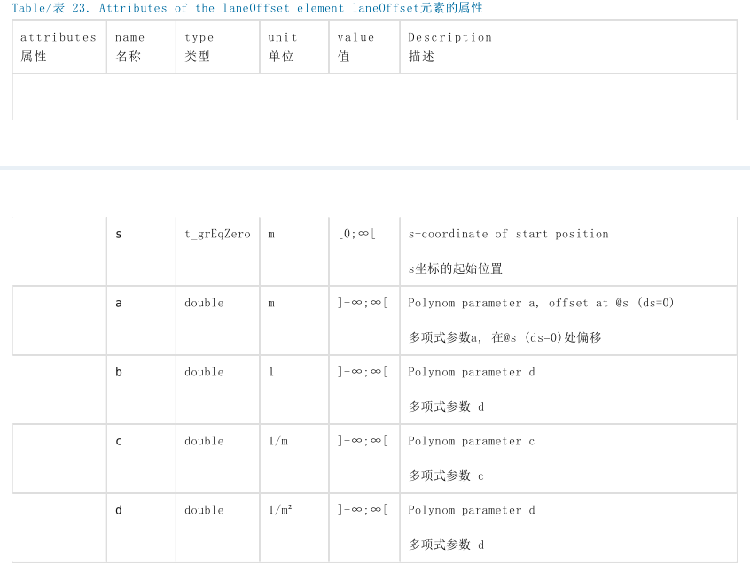 在OpenDRIVE中,车道偏移用<lanes>元素内的<laneOffset>元素来表示。