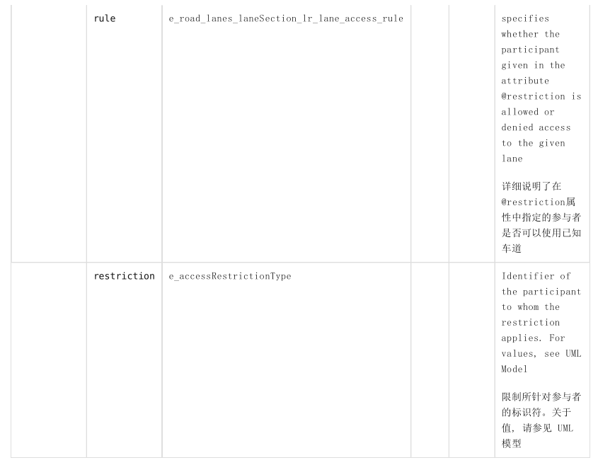 若一个车道元素内无 <access> 元素存在,则也没有使用限制。