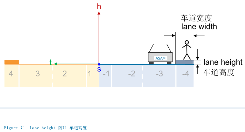 车道高度必须沿h坐标得到定义。无关于道路高程,车道高度可用于标高车道。车道高度用于执行如图71所示的小规模高程,该图展示了人行通道如何通过车道高度被拔高。车道高度被认为是偏离道路并朝z方向的偏移(包括高程、超高程和形状)。