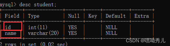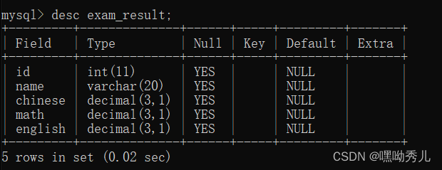 Field:字段;Type:类型;Null:是否允许为空;Key:索引类型;Default:这一列的默认值;Extra:扩充。