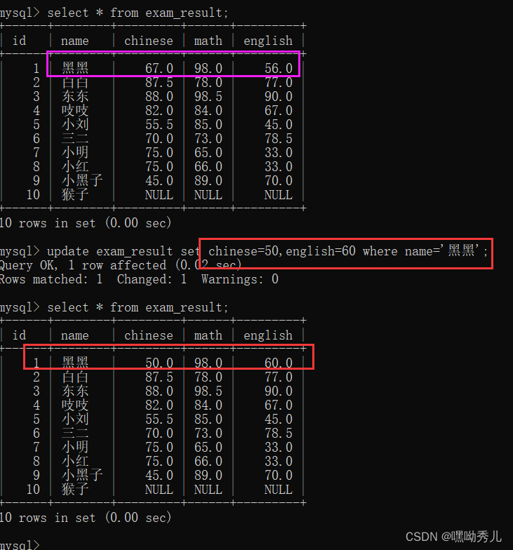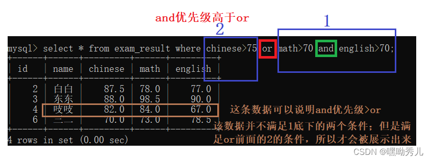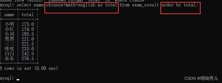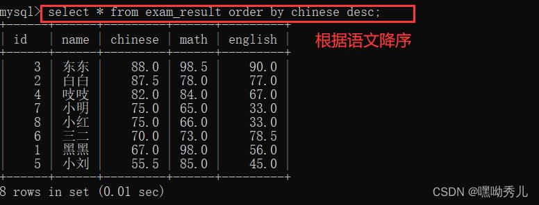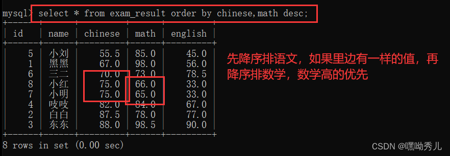 ->还可以使用多个列排序。指定多个列时,哪个列靠前,哪个列优先级就高。