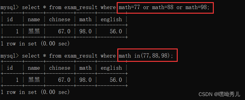 in(a,b,c......):判断当前值是否在()中出现过,出现过则认为是真。