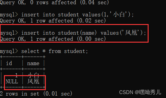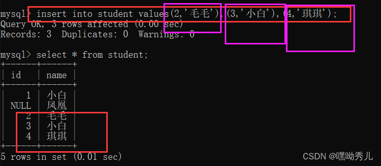 插入值的类型和个数 要与 表的列的类型、个数匹配。
