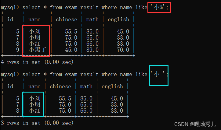 其中,%代替任意个任意字符;_代替一个任意字符。