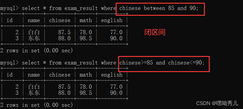 between a and b:表示判定当前的值是否在[a,b]闭区间中,