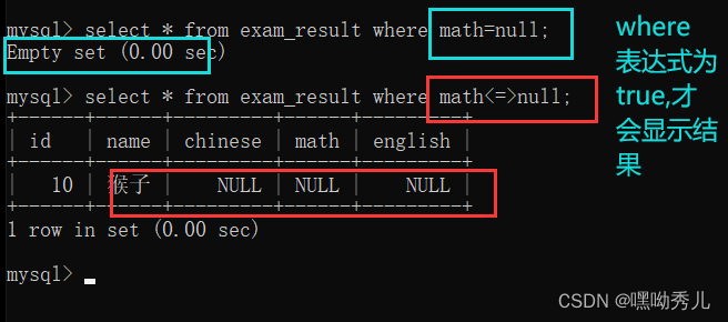 两种 等于 比较的区别:NULL=NULL,结果是NULL,相当于false;