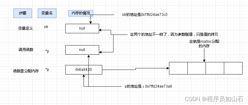 失败就是失败在,传给函数参数的变量p,与当前变量str的地址已经不一样了,它们只是存储的内容是一样的,这就决定了两边的操作,已经没有任何关系了,后来,又给没有分配内存的变量赋值,程序肯定崩溃了