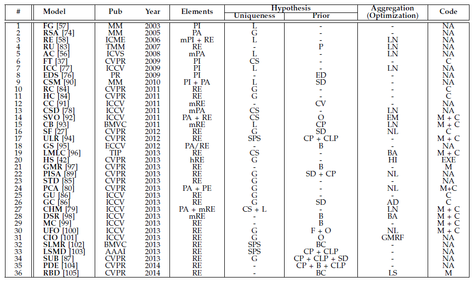 对于显著性假设 : P=通用属性,PRA=预注意线索,HD=高维特征空间中的判别性,SS=显著性相似性,CMP=显著性提示的互补,SP=采样概率,MCO=运动相干性,RP=重复性,RS=区域相似度,C=相应,DK=领域知识。