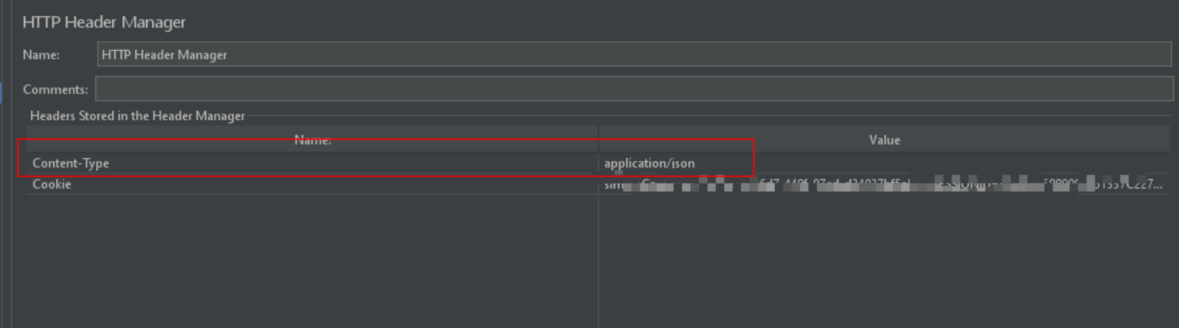 在配置元件中找到Http信息头管理中添加Content-Type为application/json;