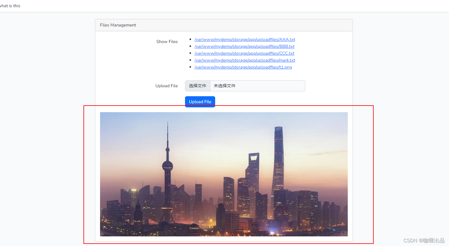 最后我们在 filemanagement.blade.php 的视图文件添加一个超链接来调用这个名为 ShowFile 的路由,如下图:
